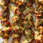 Air Fryer Garlic-Parmesan Chicken Skewers, Chicken Skewers with Garlic and Parmesan, Quick Air Fryer Chicken Dinner, Juicy Chicken Skewers, Easy Chicken Recipes - Five wooden skewers lay side by side on a white marbled surface, each filled with pieces of grilled chicken. The chicken pieces are golden-brown with charred edges and are coated with a green herb sauce mixed with red chili flakes, giving a speckled texture and color contrast. Small droplets of oil or sauce glisten on and around the skewers, adding a shiny, moist look to the dish. Photo taken with an iphone --ar 2:3 --v 7