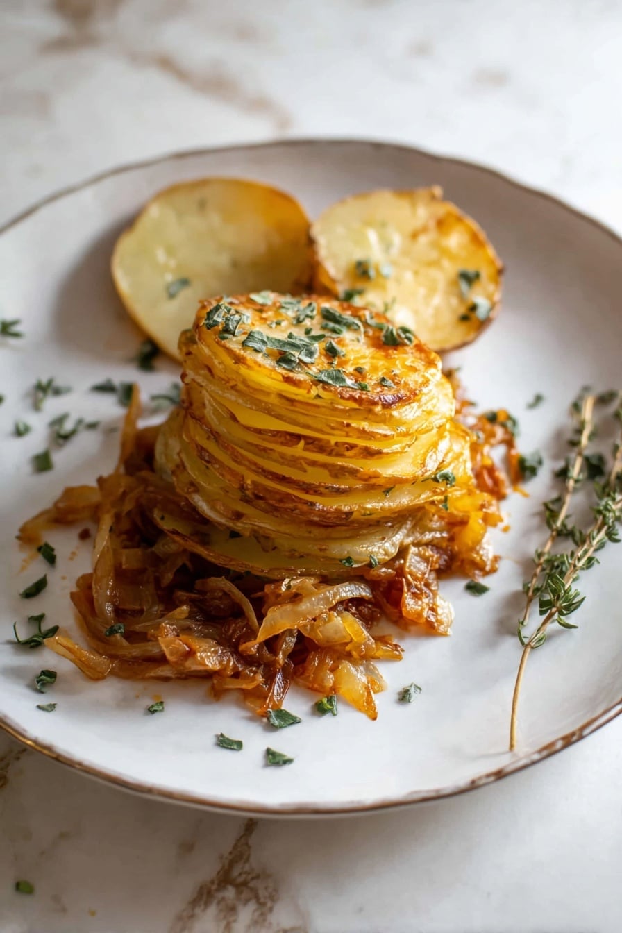 Brush that golden, garlicky brown butter all over the potatoes, making sure to coat inside the slices where it will melt into every nook. Sprinkle with your chopped fresh herbs for brightness, then pile the caramelized onions on top. Serve immediately and watch everyone fight for seconds—you won’t say I didn’t warn you.