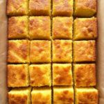 - Serve: Run a knife around edges to loosen. Use parchment overhang to lift bars from pan onto cutting board. Cut into 24 pieces. Optionally sprinkle with powdered sugar before serving.