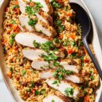 Carefully open the lid, transfer the chicken breasts to a cutting board, and cut them into bite-sized pieces. Fluff the rice directly in the pot or transfer it to a serving platter. Finally, top the rice with your chicken pieces and sprinkle fresh parsley all over for a pop of color and freshness. And voilà—dinner is served!
