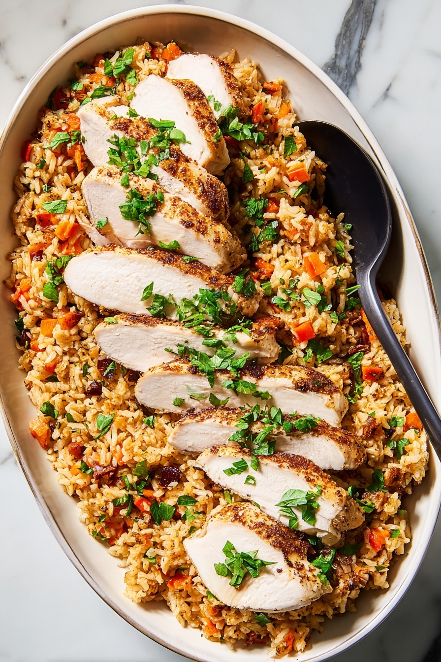 8. Serve: Transfer the rice mixture to a serving platter and fluff the rice with a fork. Top with the cut chicken pieces and sprinkle with finely chopped fresh parsley before serving.