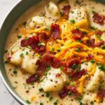 This Instant Pot Potato Soup recipe is a creamy, comforting dish perfect for any cold day. Made with russet potatoes, bacon, fresh thyme, and a blend of half-and-half and sour cream, this soup is easy to prepare in the Instant Pot, saving time while maximizing flavor. Topped with crispy bacon, cheddar cheese, and chives, this hearty soup makes a perfect main course for lunch or dinner.