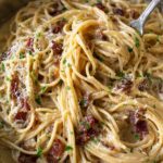 - Serve: Add the crispy bacon pieces back into the skillet with the pasta. Garnish with additional Parmigiano Reggiano cheese and sprinkle finely chopped green parsley on top before serving.