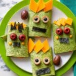 • Sliced Cheddar cheese and/or nori (seaweed wraps): These create great “hair” for your monster and can add a splash of color or texture.