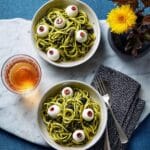 Freezing pesto spaghetti is doable, but I don’t recommend freezing the mozzarella eyeballs as they’ll lose their shape and get watery. I freeze the pesto pasta without cheese and thaw it gently in the fridge. When reheated, stir in a fresh batch of mozzarella eyeballs or shredded mozzarella for creaminess.