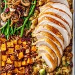 - Serve: Carve the rested turkey and serve alongside the stuffing, sweet potatoes, and green bean medley for a festive and hearty Thanksgiving meal cooked entirely on one sheet pan.