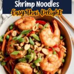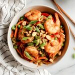 - Garnish and Serve: Remove from heat. Garnish with chopped unsalted peanuts and sliced green onions. Serve immediately and enjoy your flavorful Thai peanut shrimp noodles.